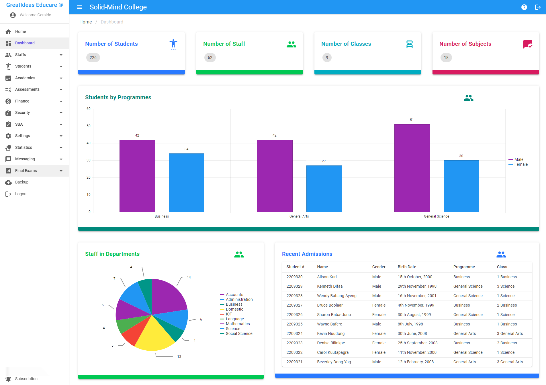 Dashboard The Admin Dashboard displays few charts and the overview of the basic transactions in the System.